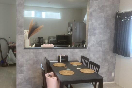 キッチンのカウンターをアクセント壁紙とシート貼りでイメージを変えました。